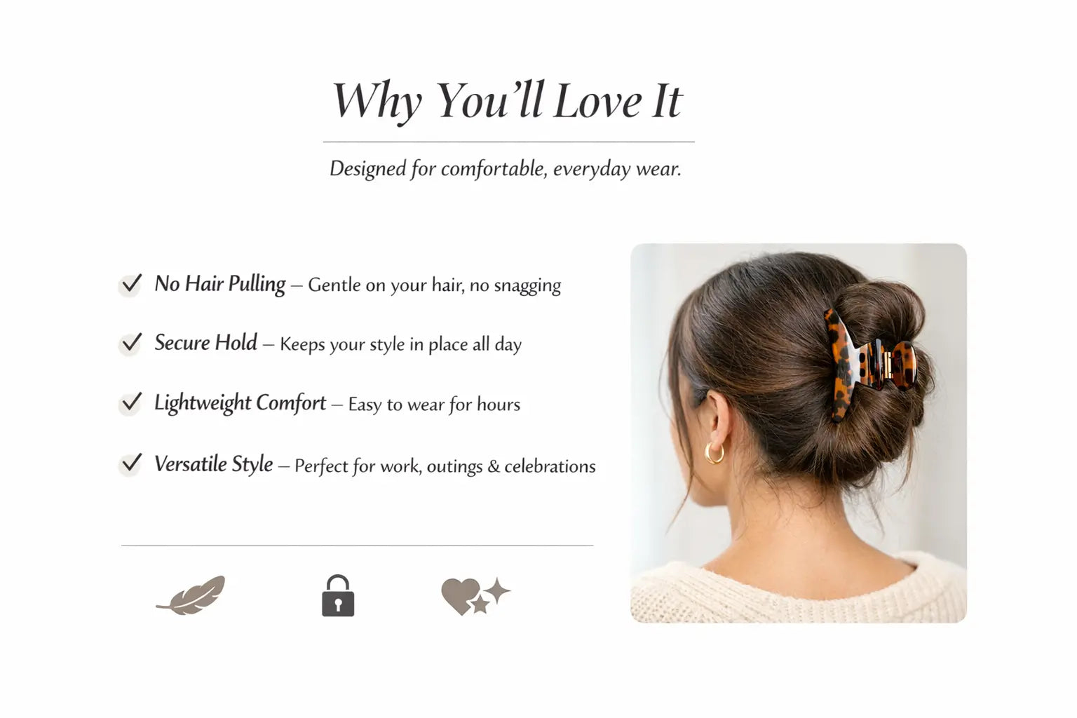 Elegant yet practical, this clip makes everyday hairstyling effortless while adding a soft polished finish to your routine looks.